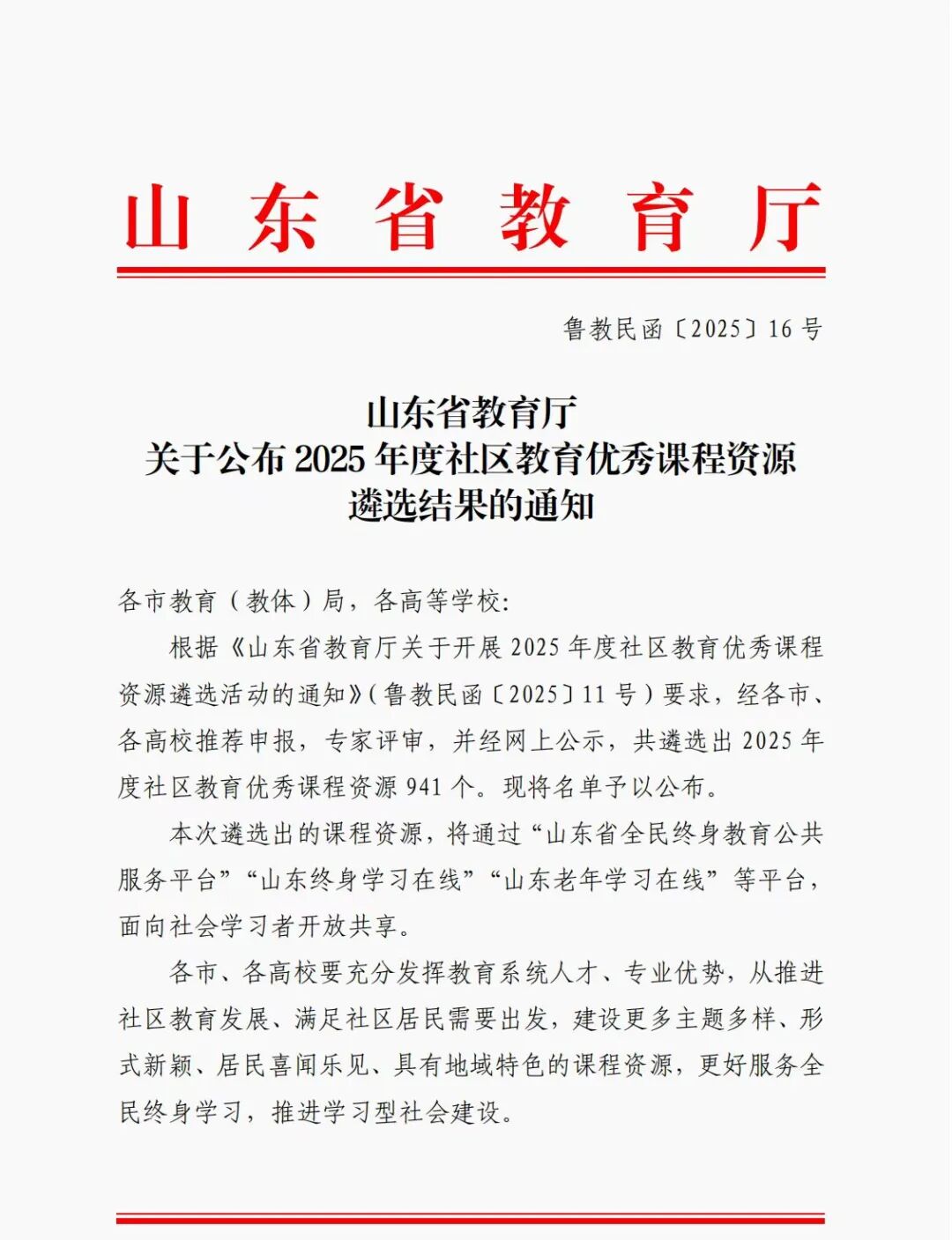 近日,山东省教育厅公示了2025年度山东省社区教育优秀课程资源遴选结果,我院两门课程:《基于马克思幸福观的养老服务能力提升理论与实践》《永不过时的“传家宝”——中华好家风》入选山东省社区教育优秀课程资源。
